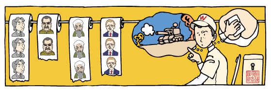 さしずめ、今なら戦争を遂行する全ての指導者達を、トイレットペーパーに描いてみてはどうだろうか。庶民は一番悪いと思う顔が描かれているトイレットペーパーを買い、自分の尻を拭くのだ。